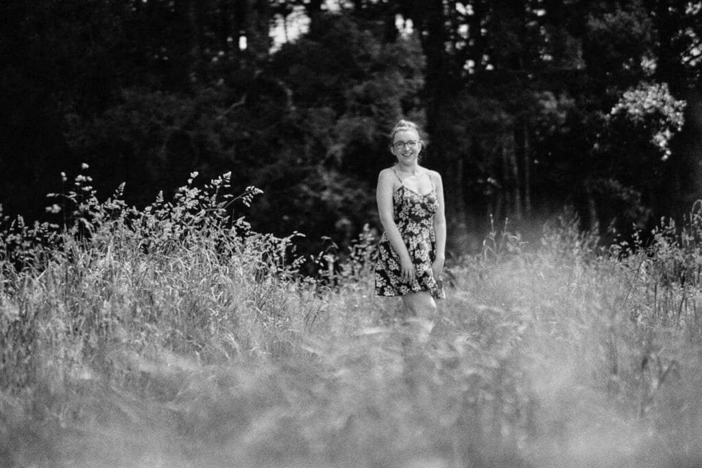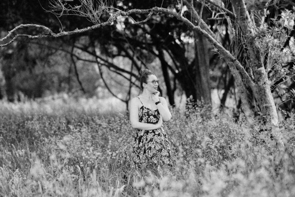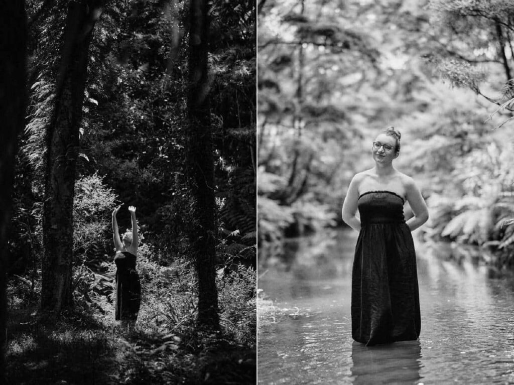 It seemed obvious we needed to grab some portrait photos too. Something classic in black and white to be a bit different from the video. Hollie had a few outfits so we were able to get variety. Because almost no one goes to the waterfall you can easily find a spot to change discreetly. I think some of the most beautiful photos are when you seem naturally happy so I might have to make some jokes to get that smile going. There is a lot of locations on the track in that you might want to use for photos too, for example, a couple of shots are on the farmland you cross just before entering the bush. Have a look at a few of the photos below.