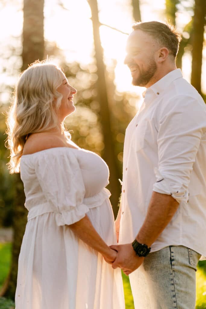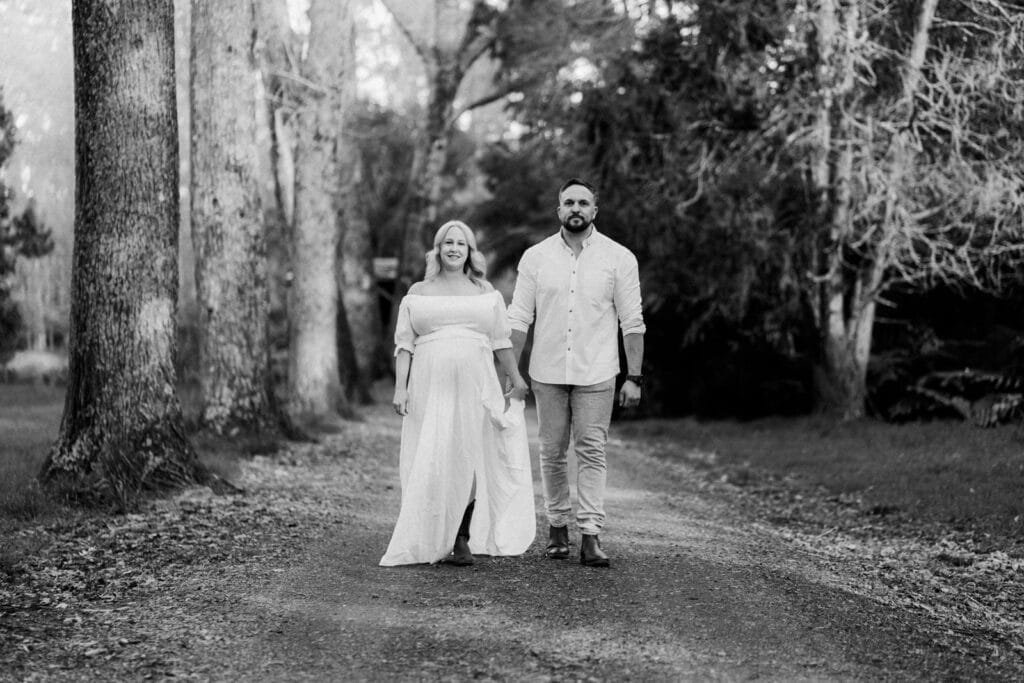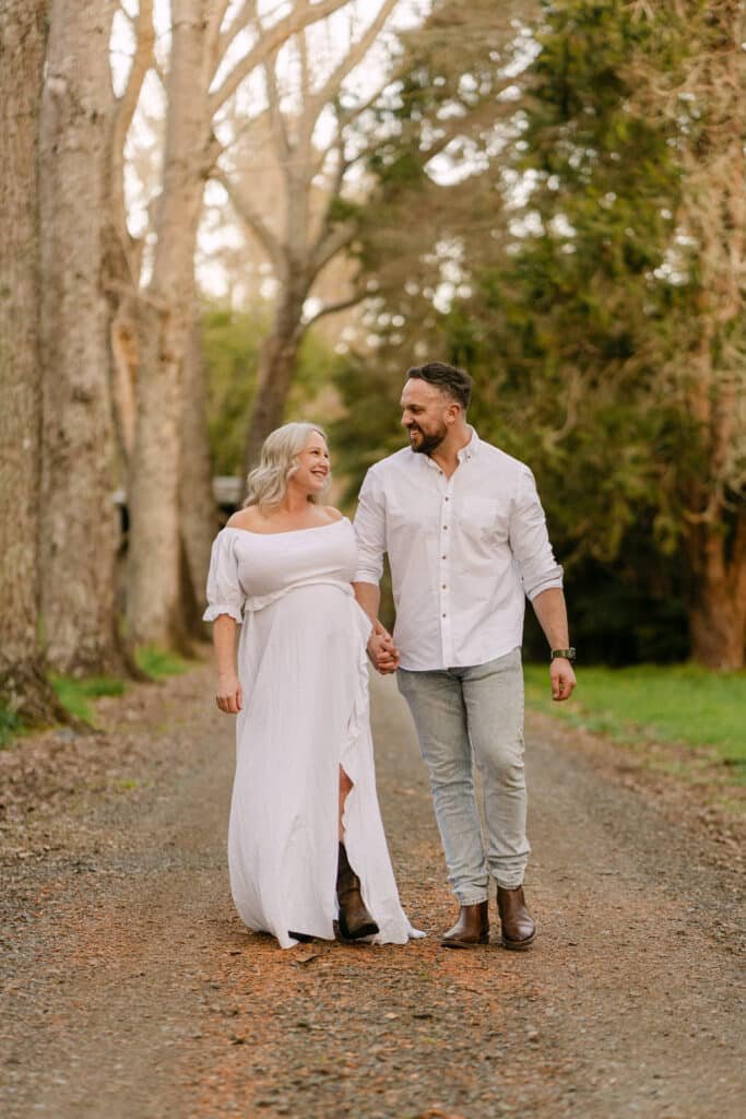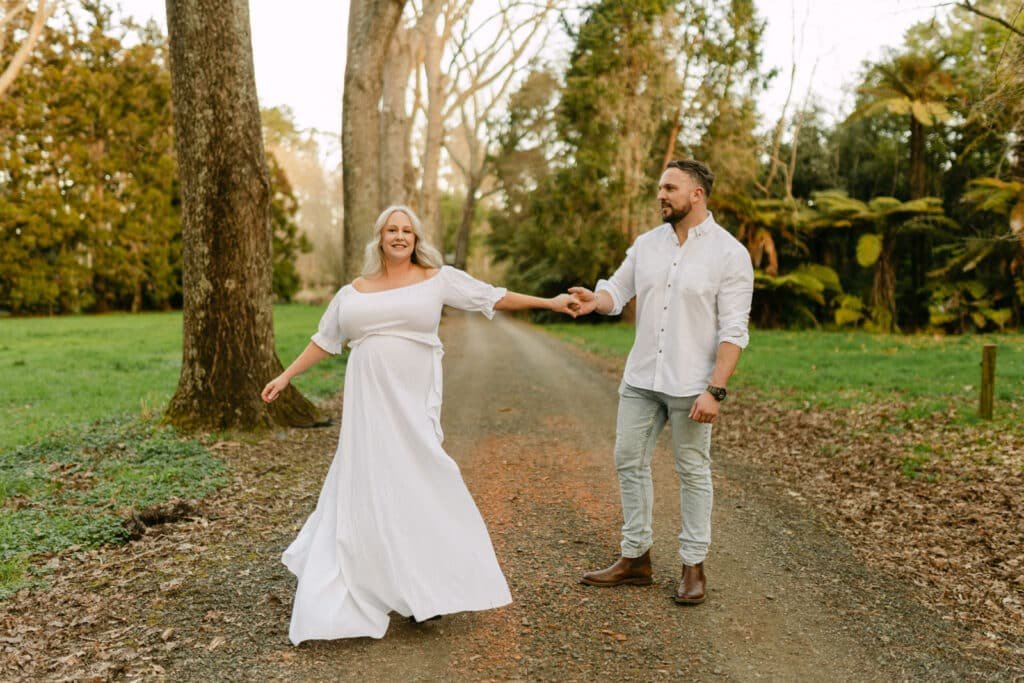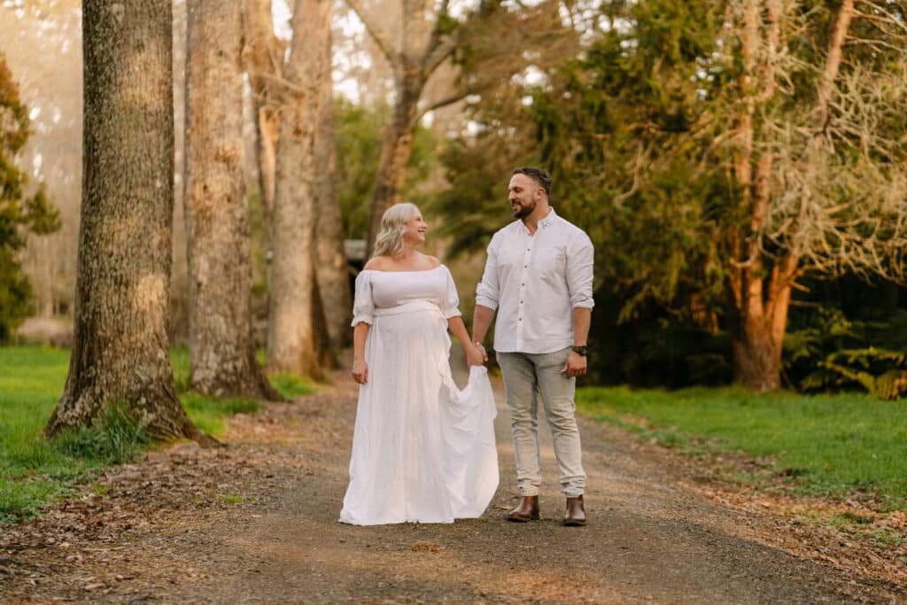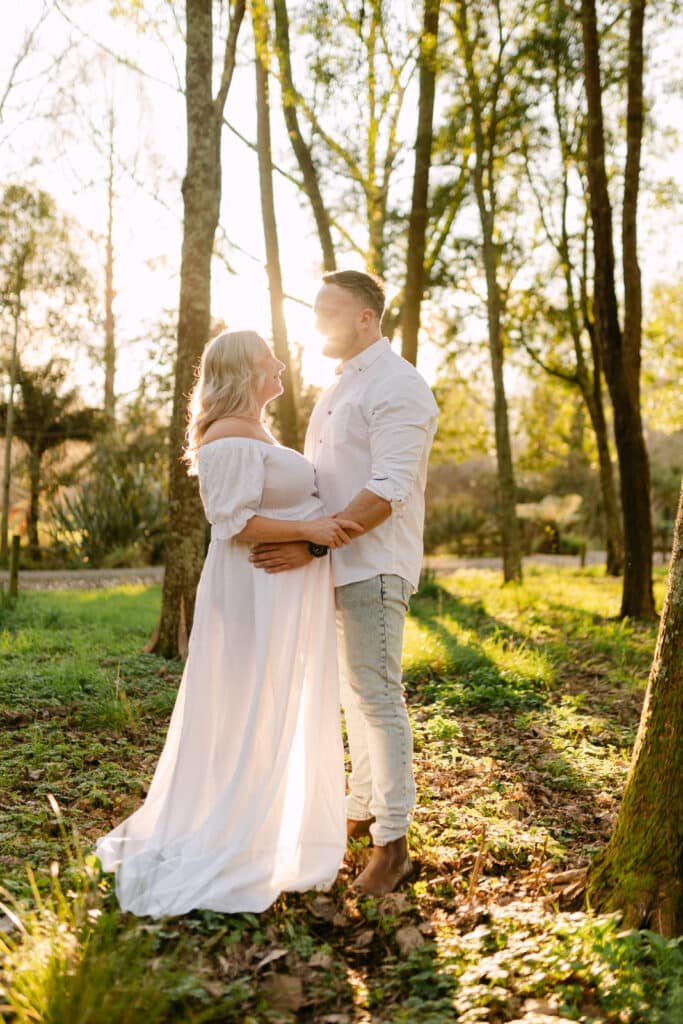 Melissa and Mike’s maternity shoot took place at one of Hamilton’s least known, but most beautiful spots for photoshoots, Taitua Arboretum, right at sunset. The golden light filtered through the trees, creating the perfect backdrop for a relaxed and personal session.