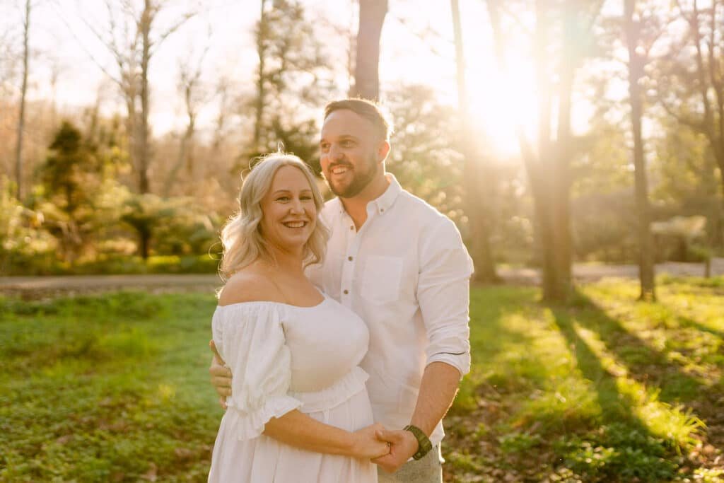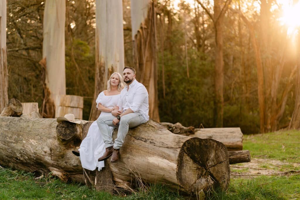 The Arboretum’s winding paths, tall trees, and fallen logs gave us plenty of opportunities to mix natural textures with soft, warm light. From the two of them walking hand-in-hand to quiet moments sitting together on the logs, the whole shoot felt easy and genuine, a reflection of their connection and excitement for what’s ahead.