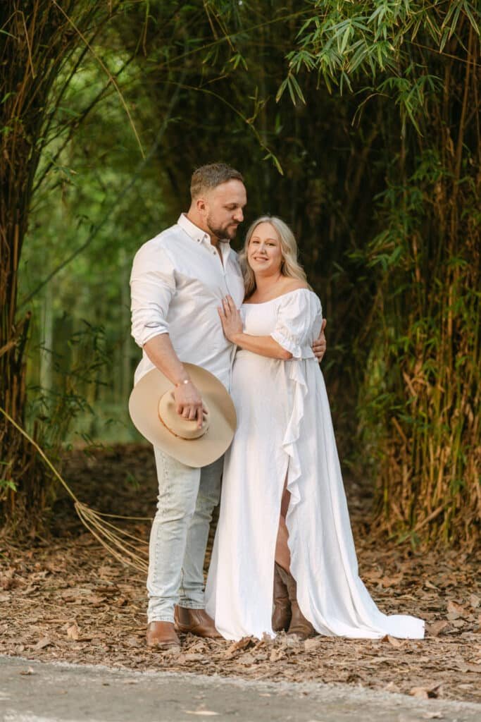 Melissa’s flowing white dress caught the light beautifully, and paired with Mike’s simple, classic look, the two of them stood out while still blending seamlessly into the natural setting. The cowboy hat made an appearance too, adding a playful, personal touch that kept the shoot uniquely theirs.