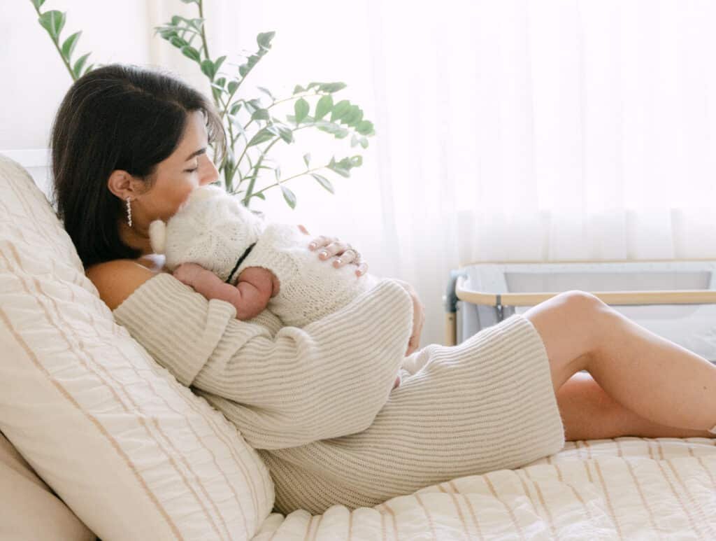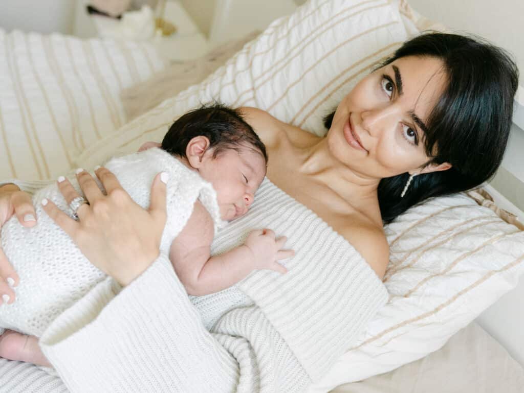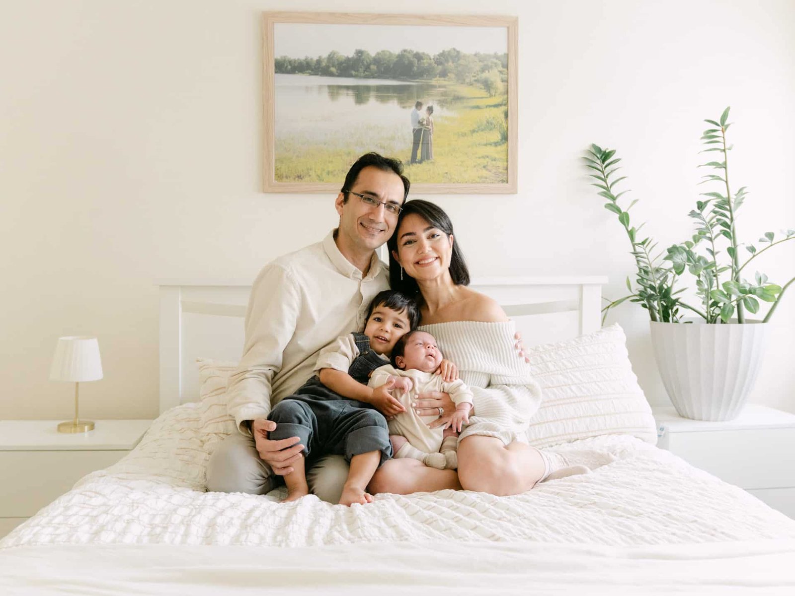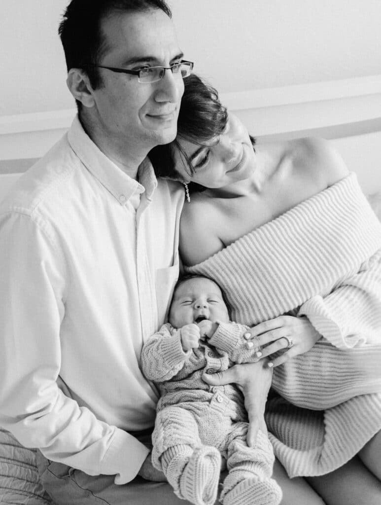 We shot everything on the couch and the bed using the window light. No studio, no fancy props. Just their home, their family, and a very new little person.