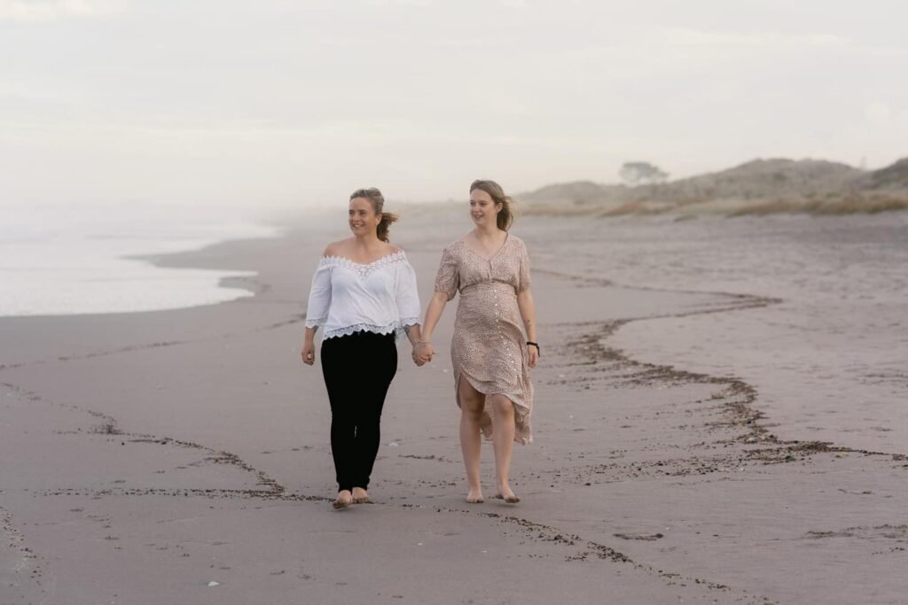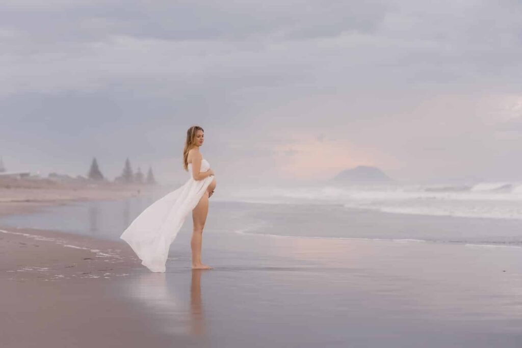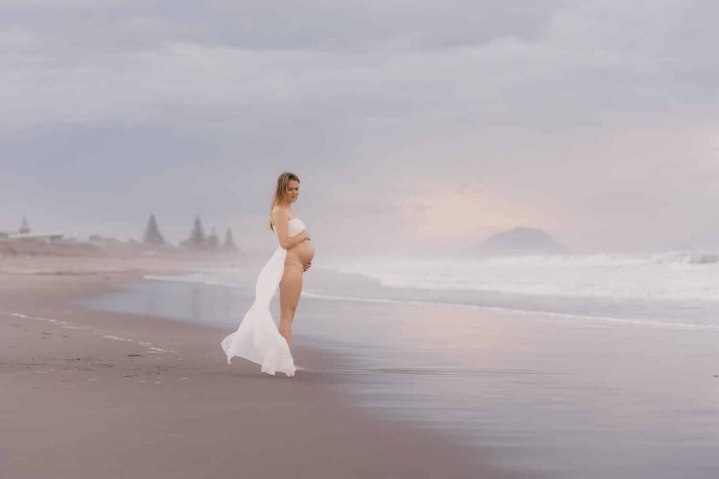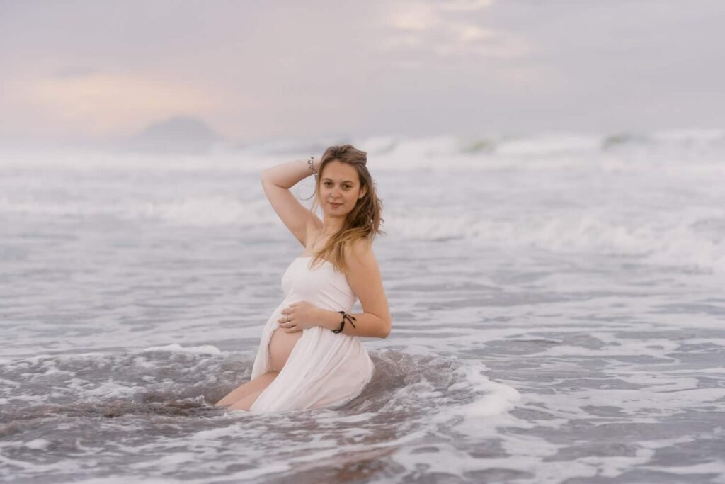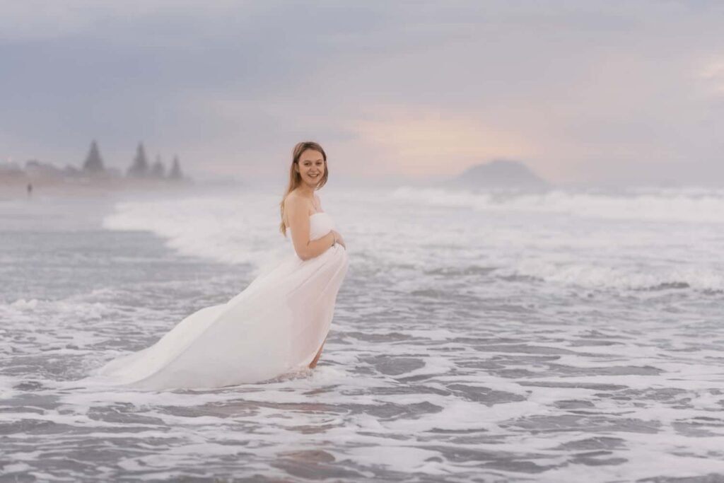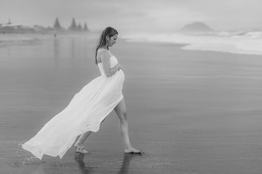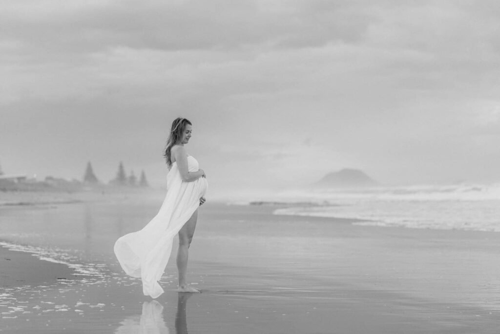 Beautiful, relaxed Papamoa maternity shoot with Rhiannon and her mum Rachel. It was raining, and it looked like we might have to postpone things at the start. But they stuck it out, and things cleared, leaving an empty beach for us to play on. And you know me… gotta end up in the water!