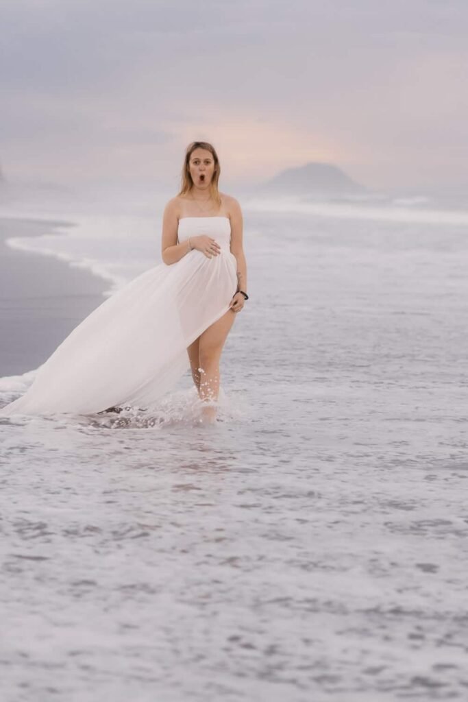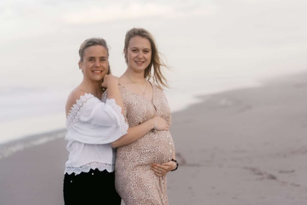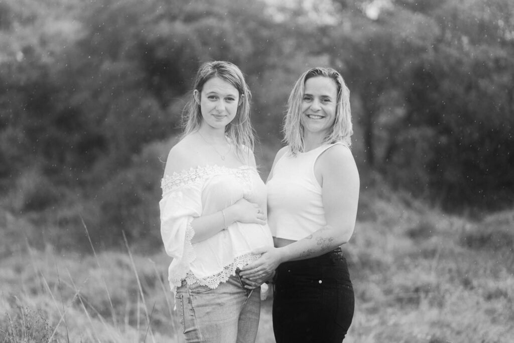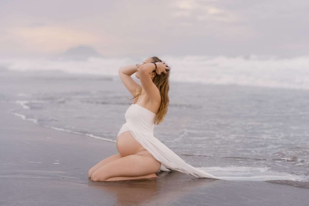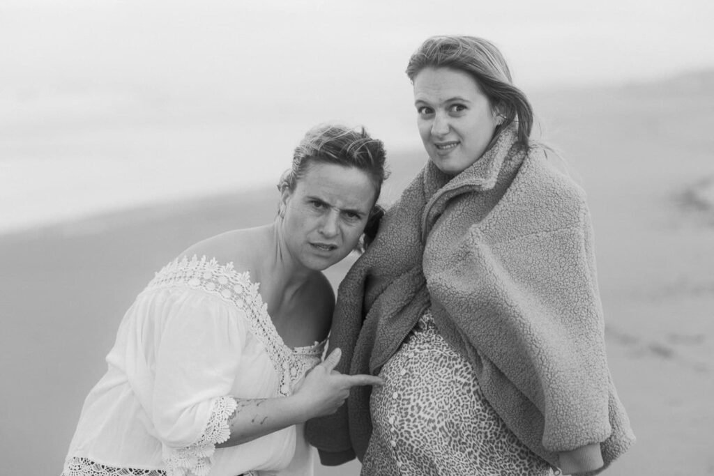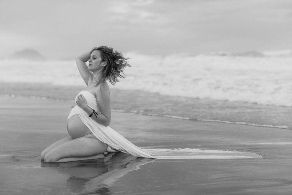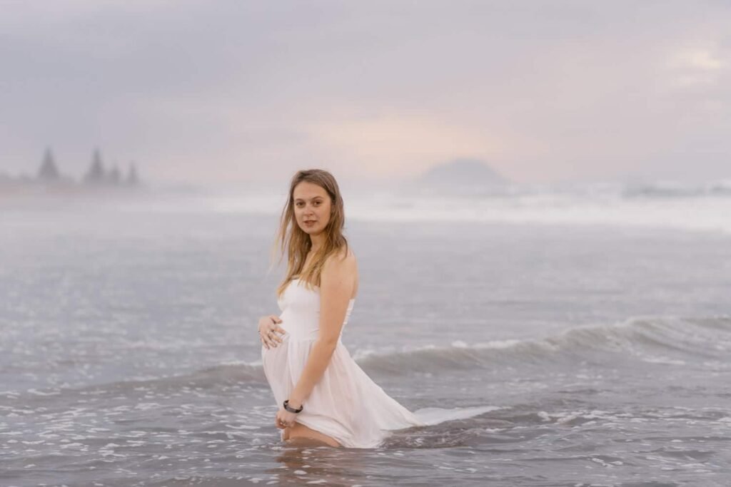 Beautiful, relaxed Papamoa maternity shoot with Rhiannon and her mum Rachel. It was raining, and it looked like we might have to postpone things at the start. But they stuck it out, and things cleared, leaving an empty beach for us to play on. And you know me… gotta end up in the water!