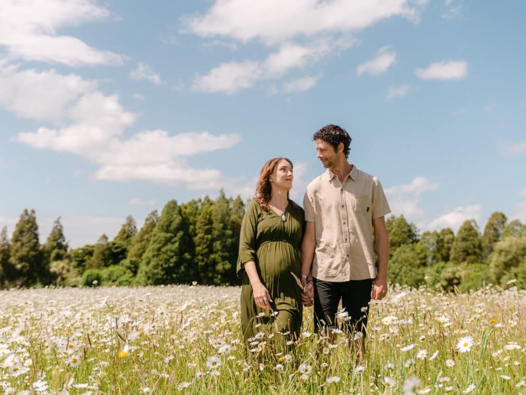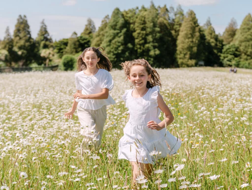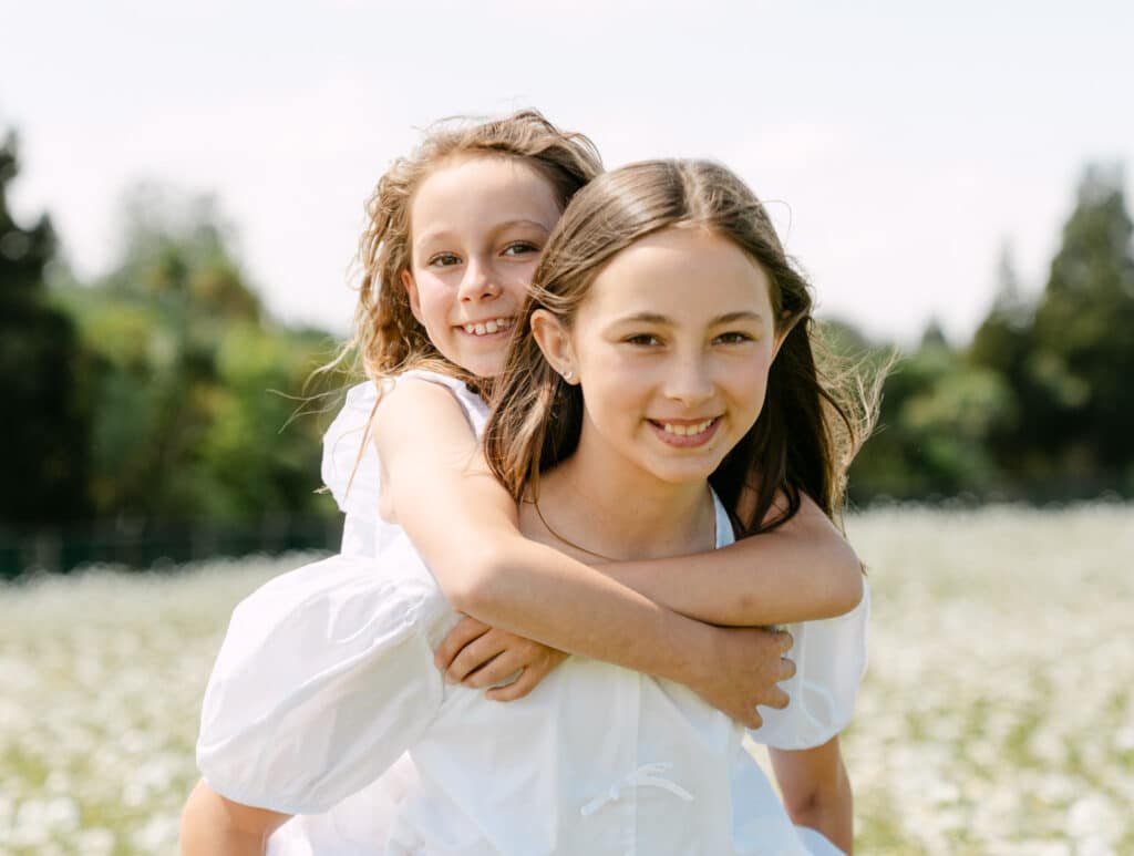 We started outdoors in a field full of daisies. The girls were in their element, running through the flowers, picking bunches, doing their own thing while I worked around them. Samantha and Luke were relaxed and easy to photograph together, and the light was generous, bright sun, blue sky, the kind of afternoon you hope for.